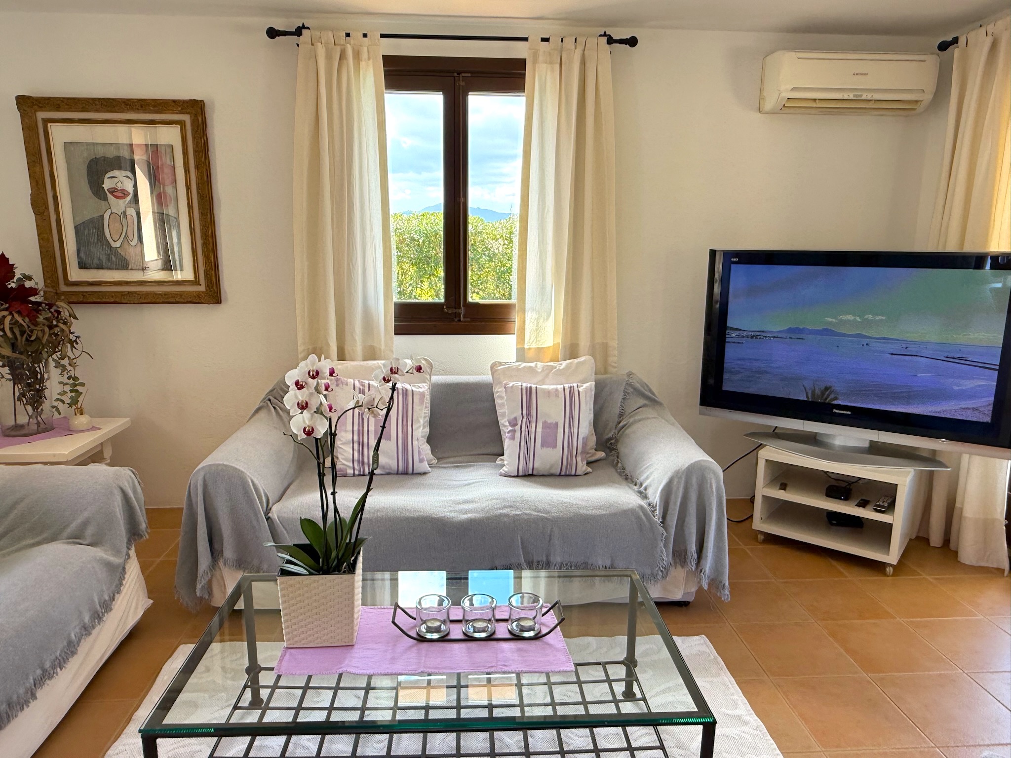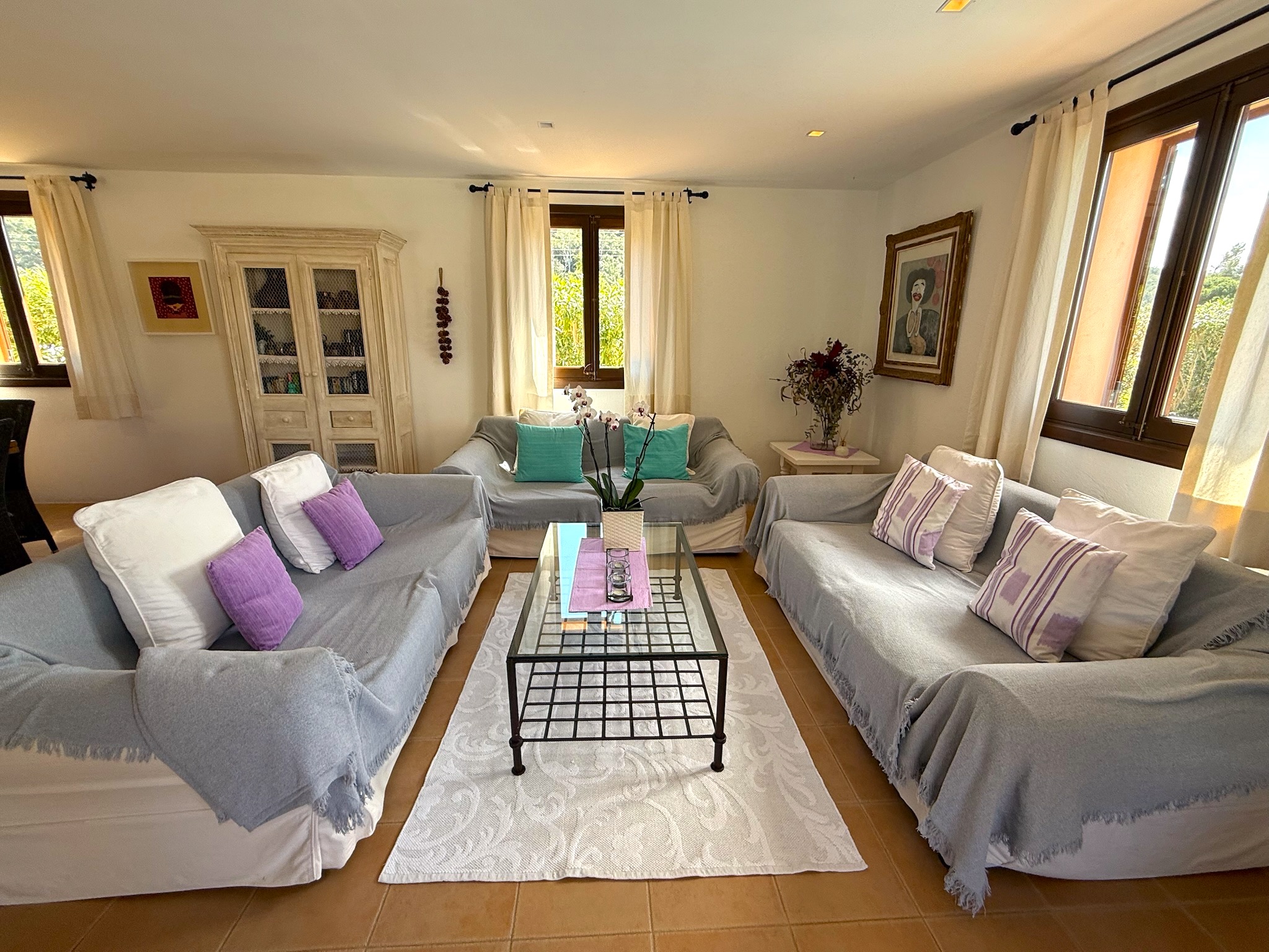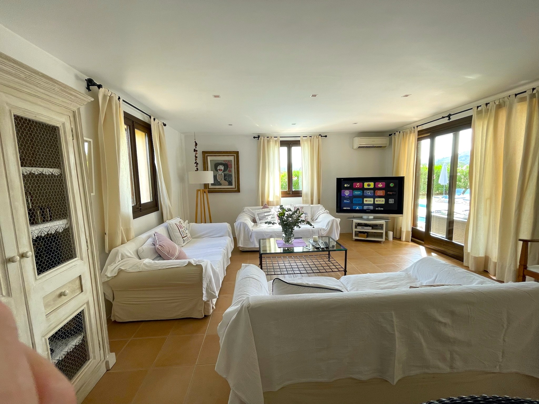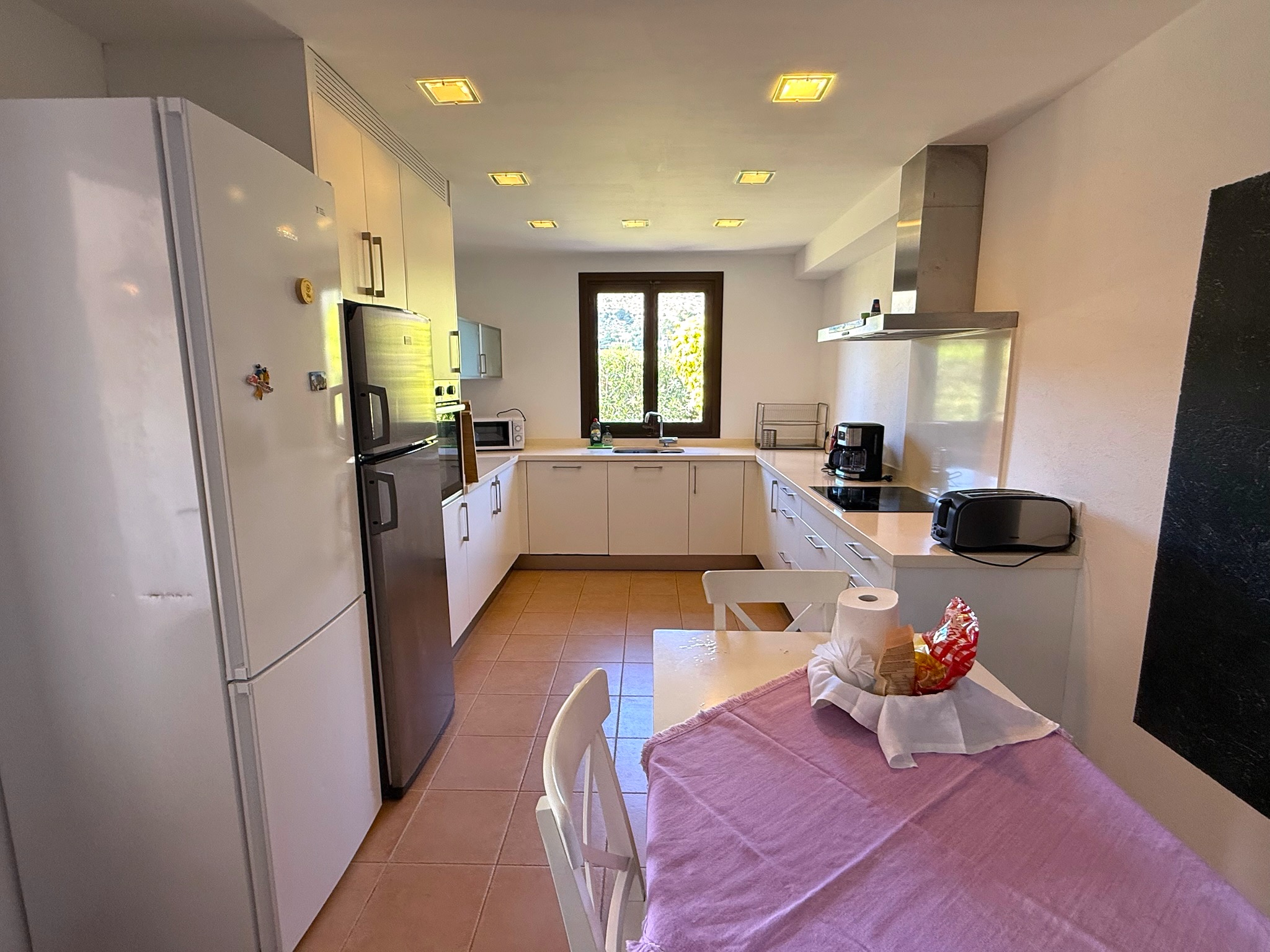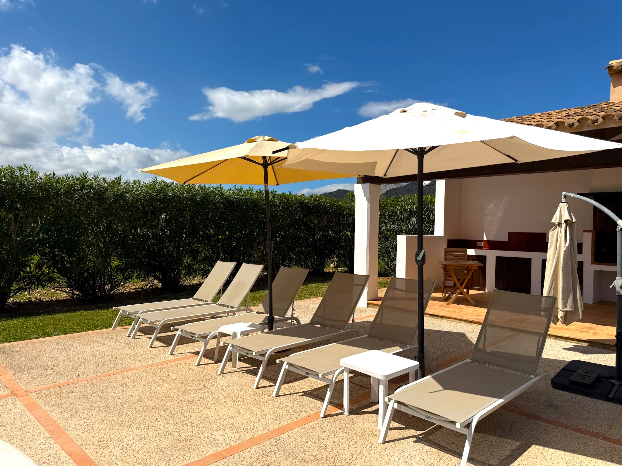 Fantastic Villa in close to Puerto Pollensa and the beach. Aproximately 1 Km after Puerto Pollensa, a sign “La Vinya” leads to a small way away from the main road. At the end of this path we find the lovely house “La Vinya”. Surrounded by nature and some olive trees, the house is in a quiet place away from the louder roads. A wide parking area invites to park the car (or bicycles) and enter the main entrance of the house. The hall is spacious and very high. In front of us there is a staircase that leads to the dormitories in the first floor. Here we find three bedrooms and two bathrooms, one in suite and the other one with bath. Back to the entrance we look at the left side and find ground floor bedroom and a bathroom (shower). Straight on there is the sitting-dining room, passing the kitchen at the right side. Next to the kitchen we find the laundry and the second ground floor bedroom. The spacious sitting room offers views to the country side and to the pool. Two slide doors give access to the nice, great terrace. Here it is an ideal place for having meals or just relax in the sofas. The swimming pool (9×4.5×1.5) and the large barbacue are next to the terrace and complete a round holiday: Enjoy this family villa with great facilities near to the Puerto Pollensa center and the beach!