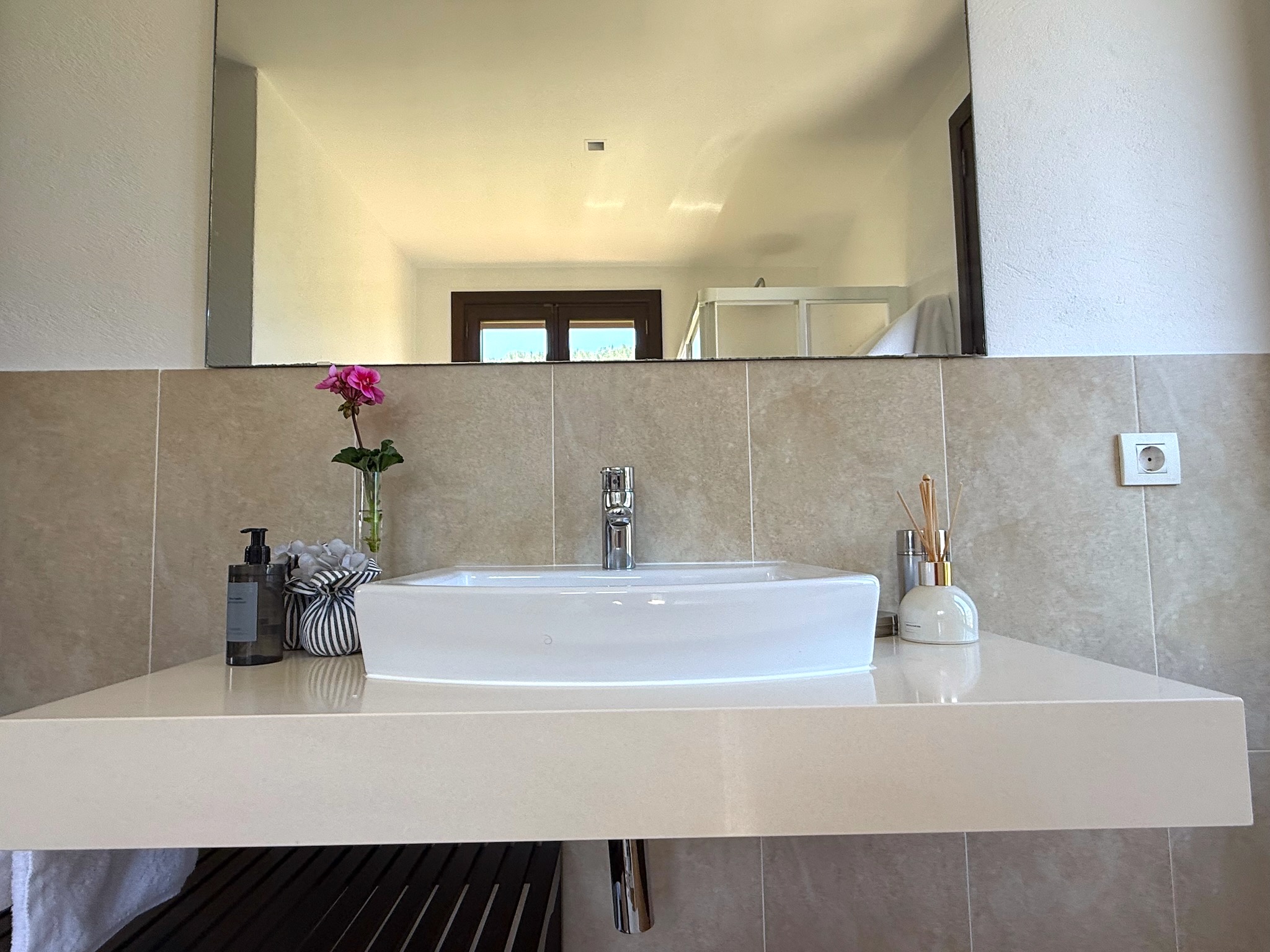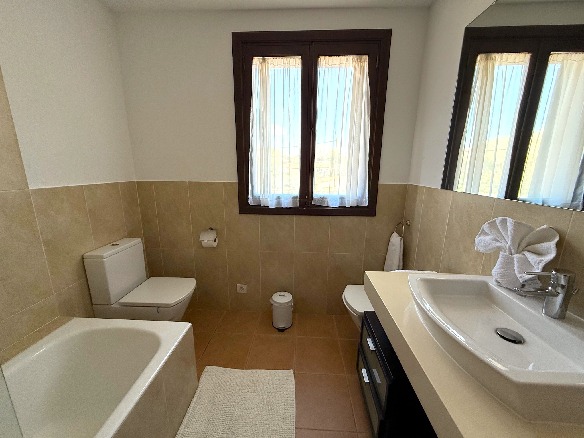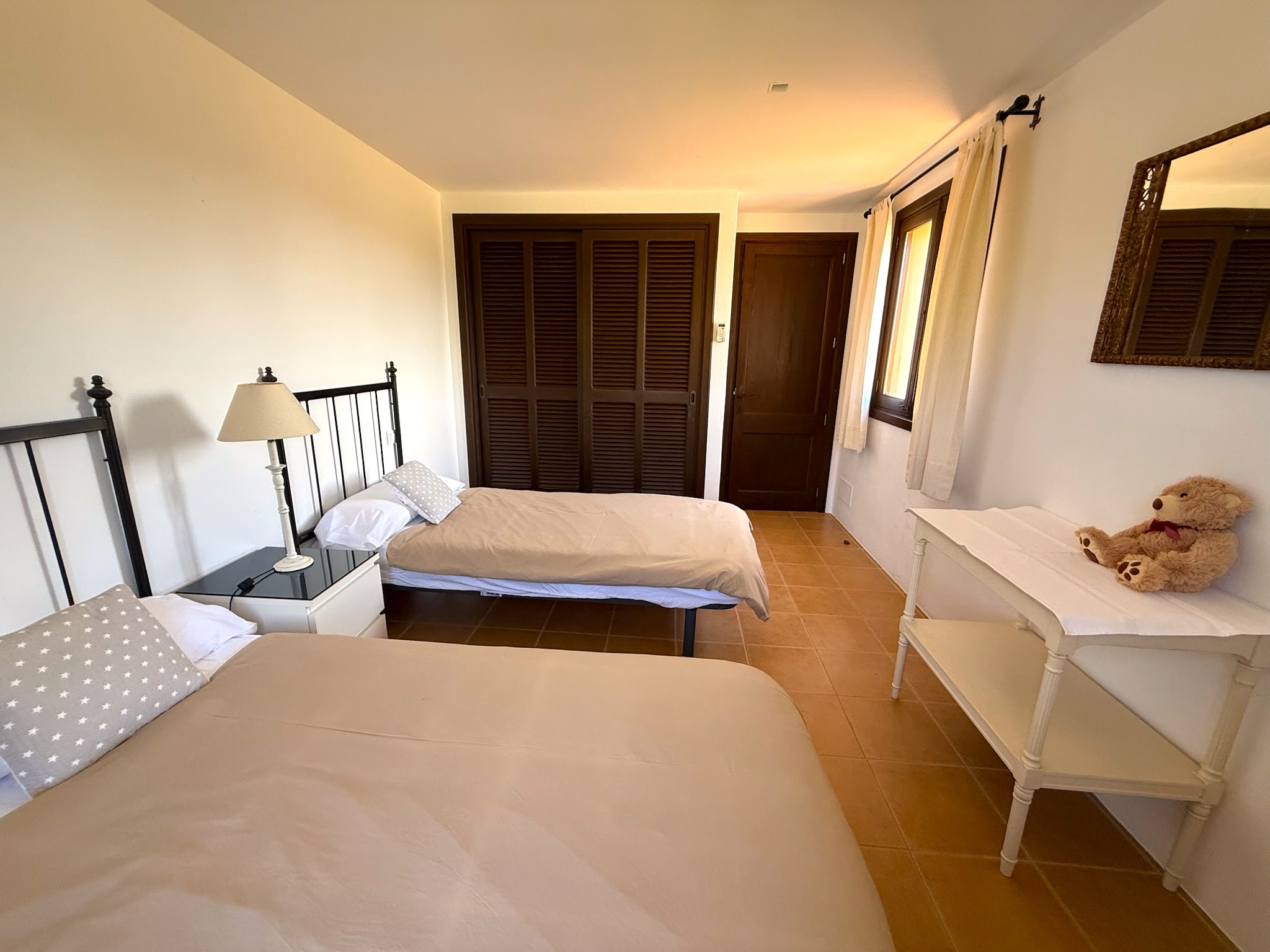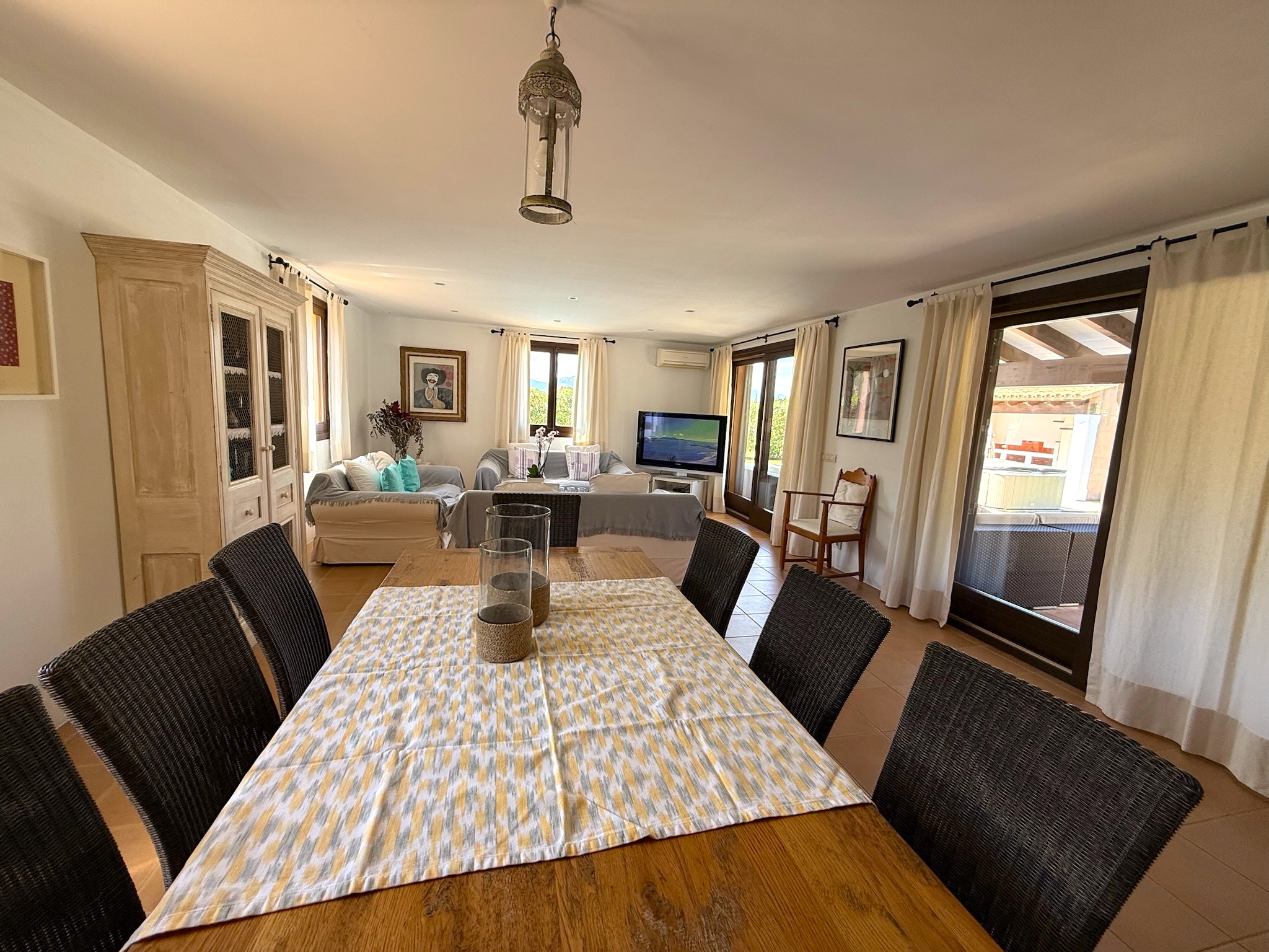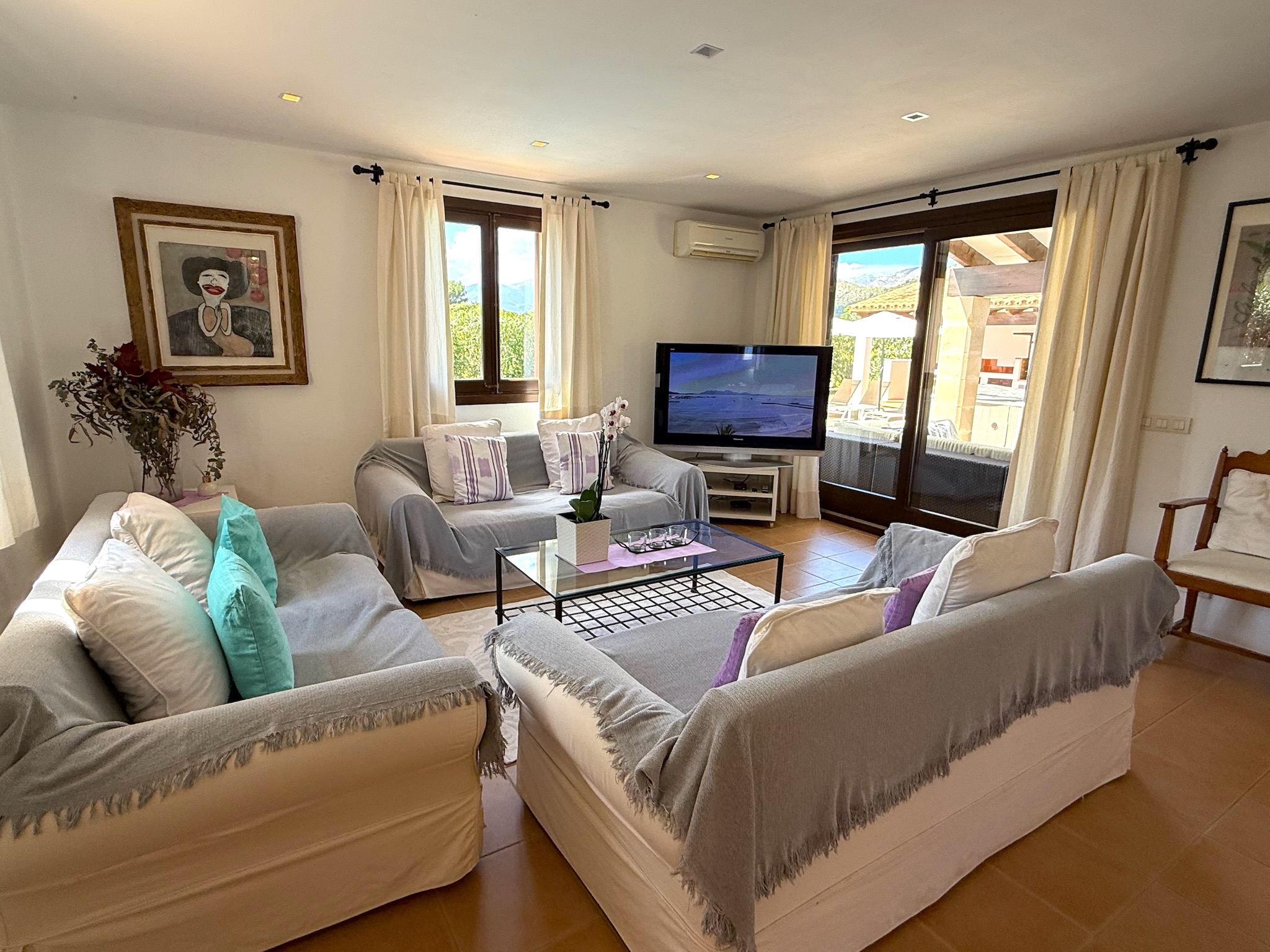 Fantastic Villa in close to Puerto Pollensa and the beach. Aproximately 1 Km after Puerto Pollensa, a sign “La Vinya” leads to a small way away from the main road. At the end of this path we find the lovely house “La Vinya”. Surrounded by nature and some olive trees, the house is in a quiet place away from the louder roads. A wide parking area invites to park the car (or bicycles) and enter the main entrance of the house. The hall is spacious and very high. In front of us there is a staircase that leads to the dormitories in the first floor. Here we find three bedrooms and two bathrooms, one in suite and the other one with bath. Back to the entrance we look at the left side and find ground floor bedroom and a bathroom (shower). Straight on there is the sitting-dining room, passing the kitchen at the right side. Next to the kitchen we find the laundry and the second ground floor bedroom. The spacious sitting room offers views to the country side and to the pool. Two slide doors give access to the nice, great terrace. Here it is an ideal place for having meals or just relax in the sofas. The swimming pool (9×4.5×1.5) and the large barbacue are next to the terrace and complete a round holiday: Enjoy this family villa with great facilities near to the Puerto Pollensa center and the beach!